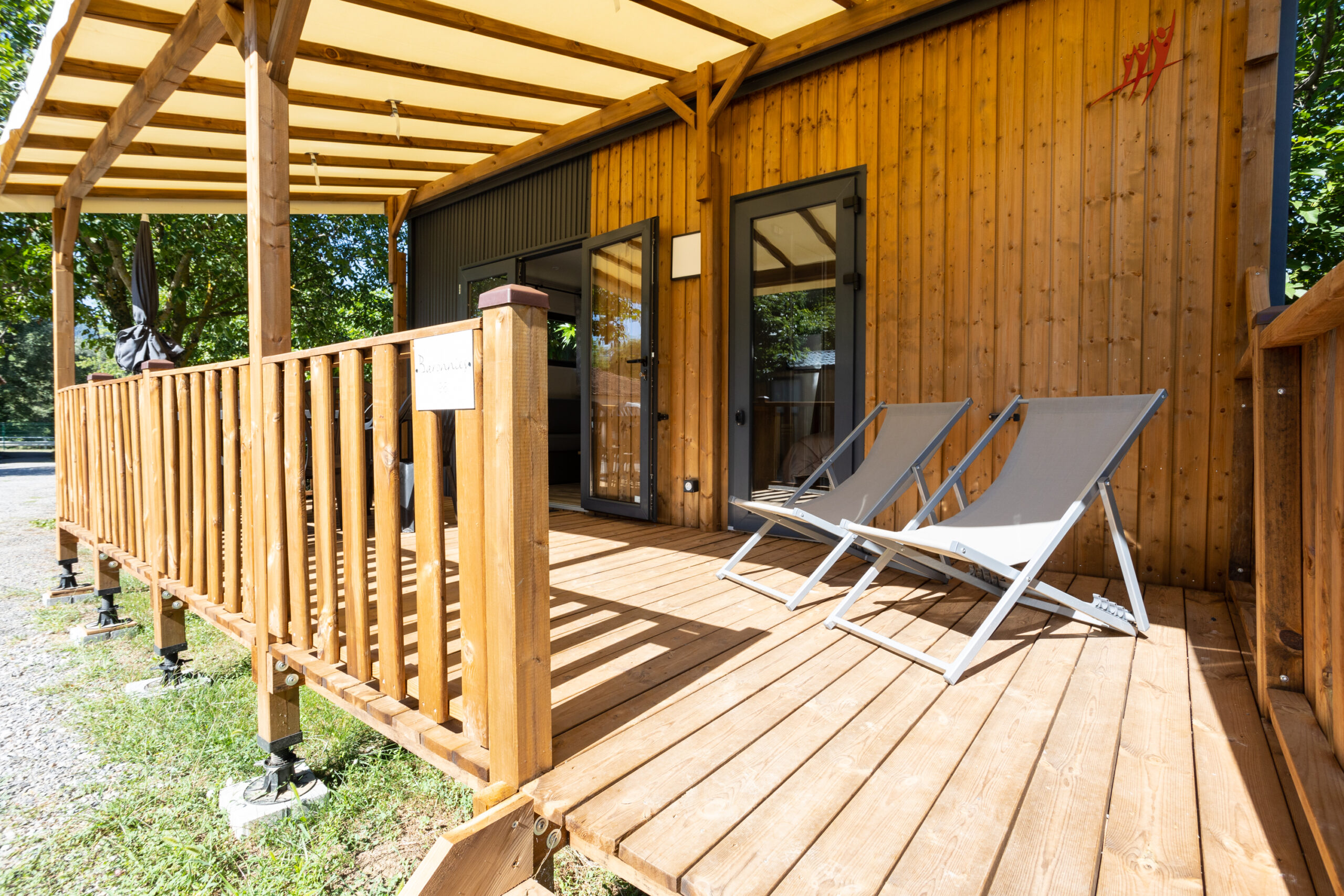 Atypische Unterkunft für 2 Personen ohne Sanitäranlagen oder Wasseranschluss. Die gemeinsamen Sanitäranlagen befinden sich in der Nähe der Unterkunft. Überdachte Holzterrasse mit 2 Relaxstühlen und einem niedrigen Tisch. Die Unterkunft ist mit einem 140 cm breiten Bett, einem kleinen Kühlschrank, einer Mikrowelle, einem Kocher, einem Wasserkocher und Geschirr ausgestattet.